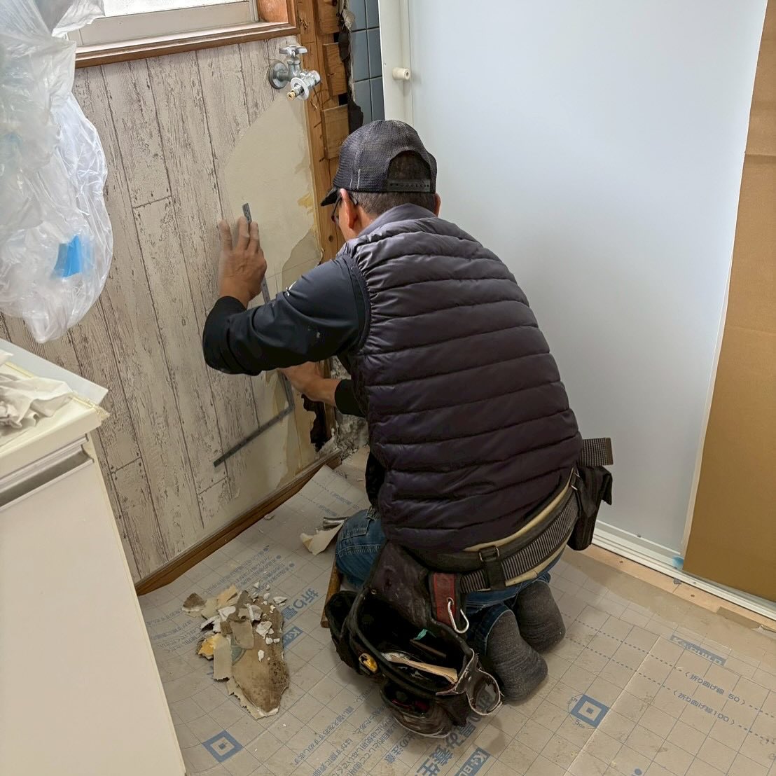 入居者が退去したので洗面台の交換のご依頼をいただきました。 25年ほど住んでいたようで洗面台を外すと根太がなくシロアリの被害もあっていたので床の交換とタイルからクロスへの交換も行いました。 ミライ建創長崎は、室内外のお困りごとは何でも承っ…