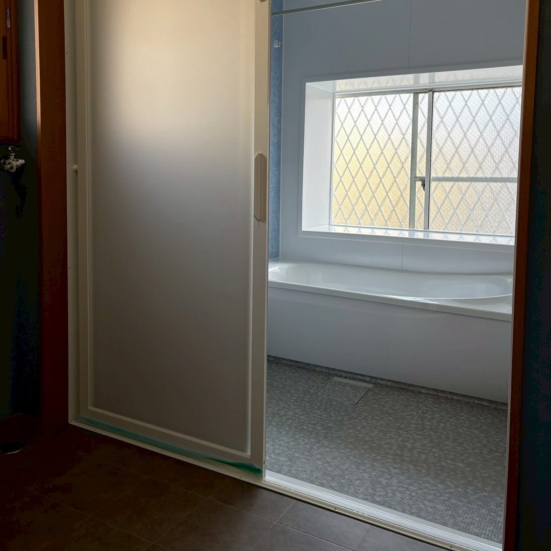お風呂の交換のご依頼をいただいたため、システムバスの交換工事と脱衣所の壁紙、クッションフロアの交換工事を行いました。