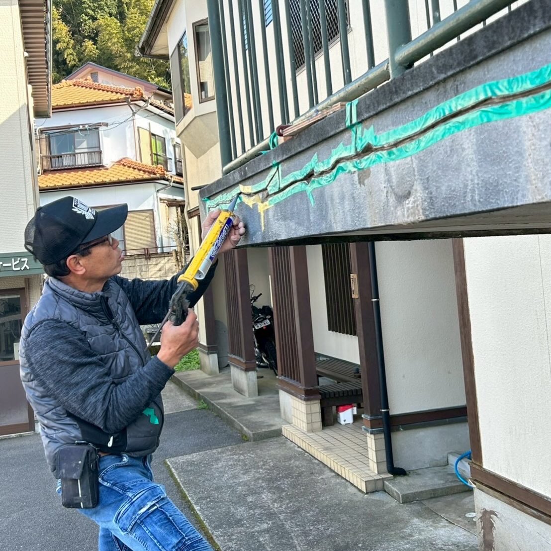ひび割れ部分には水分が入らないようにコーキングを行い、剥がれた部分は補修工事を行いました。
